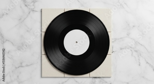 © SHAHADAT, Obraz premium A black vinyl record on a square tile on a marble background