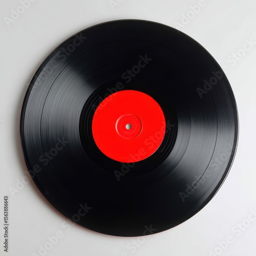 © AK vactor, Fototapeta premium A black vinyl record with a bright red label centered on a white background