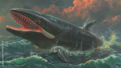 © MuhammadAzriel, Fototapeta premium A Black Whale Leaps From the Ocean