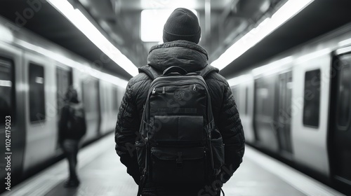 © jobim, Naklejka premium a black-white full body, back view photo of a Backpacker of age 20-25 standing on a metro platform moving metro train on background. cinematic. highly detailed, high resolution for magazine.