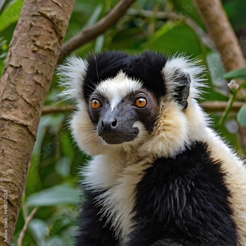 © SYED, Obraz premium A Black White Ruffed Lemur.