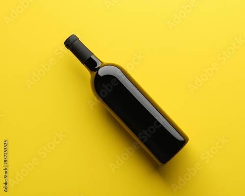 © Amara, Fototapeta premium A Black Wine Bottle Laying on a Bright Yellow Background Minimalism Concept Bottle Mockup