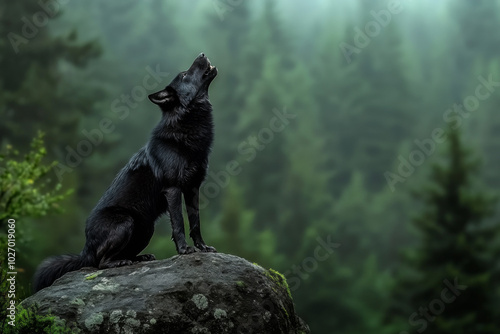 Naklejka premium A black wolf howling on a rock in a misty forest during early morning