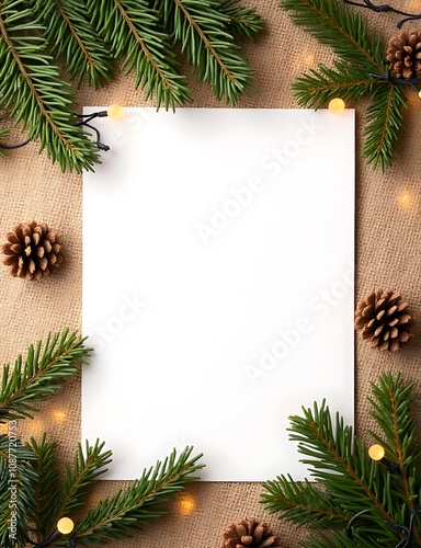 Fototapeta premium A blank Christmas card features fir branches, pinecones, and string lights on...