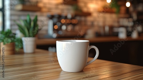 Fototapeta premium A blank coffee cup on a counter with a modern cafa background