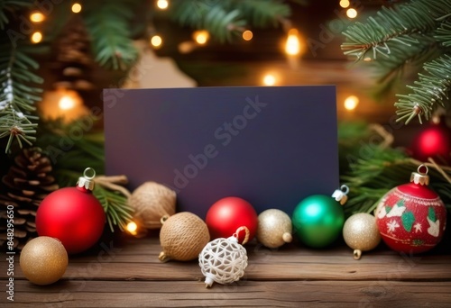 © iqra, Obraz premium A blank greeting card surrounded by vintage Christmas decorations on a wooden background