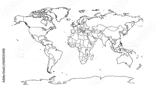 Fototapeta premium A blank political world map illustration, showing country borders in outline against a white background.