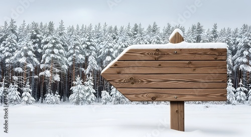 © Elladine's Room, Fototapeta premium A blank rustic wooden arrow sign offering direction with a serene winter aesthetic, set against a beautiful snow-covered pine forest