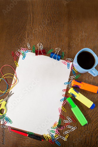 Fototapeta premium A blank white paper with cup of coffee and different office tools on the table