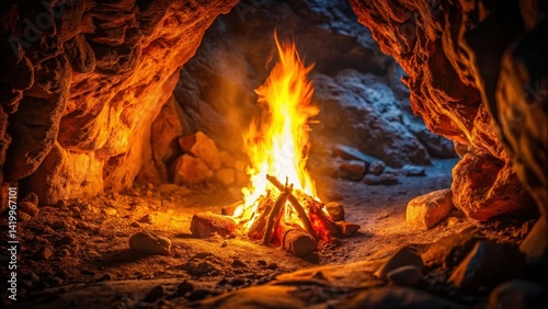 Obraz premium A blazing fire crackles in the darkness of a cave, illuminated only by...