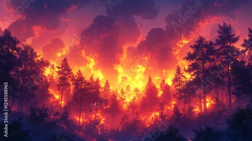 © Ceyhun, Fototapeta premium A blazing forest fire spreading rapidly, creating a dramatic and intense atmosphere