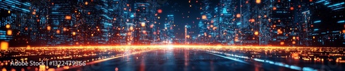 Naklejka premium A blend of Matrix and mixed media features a virtual city skyline rendered in...