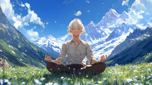 © Anna, Fototapeta premium A blond anime style guy meditates in the mountains.