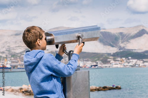 © Dyachenko, Obraz premium A blonde boy looks through a city telescope against a background of mountains and the sea