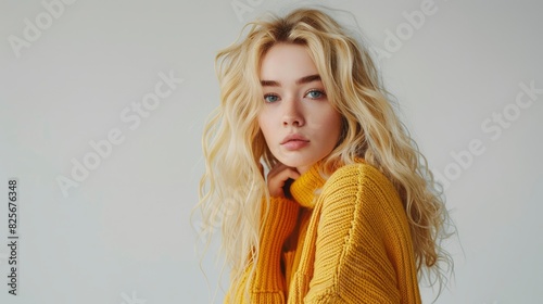 Fototapeta premium A Blonde-Haired Girl In A Yellow Sweater Posing Confidently In A Studio...