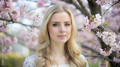 © Andrei, Fototapeta premium A blonde with a gentle smile against the backdrop of brightly blooming sakura branches.