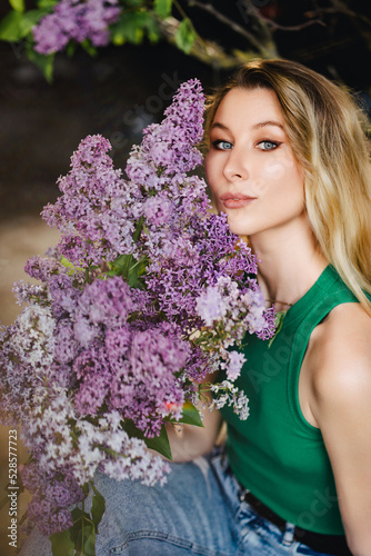 © andrey, Fototapeta premium a blonde woman in a green top and jeans with lilac flowers.