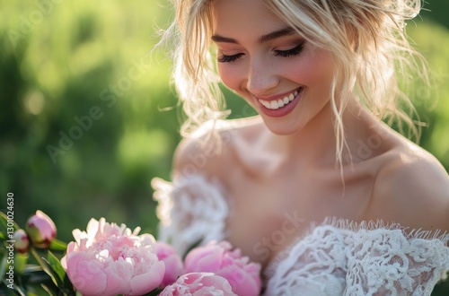 © Kien, Fototapeta premium a blonde woman in a white dress, smiling and holding a bouquet, looking at the camera, with a grassy background