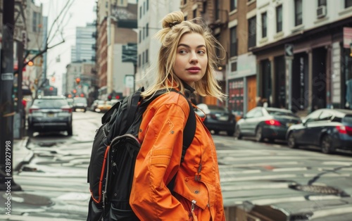 © imagineRbc, Fototapeta premium A blonde woman in an orange jacket is standing on a city street
