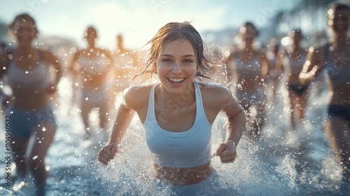 © Surachetsh, Obraz premium A blonde woman joyfully splashes through the water on a sunny beach, highlighting the vibrant energy and carefree vibe ideal for summer vacation or fitness branding.