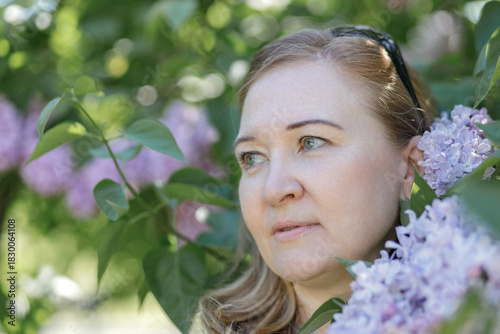© Светлана Густова, Fototapeta premium A blonde woman stands near blooming lilacs in a city park. Summer.
