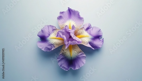 Obraz premium A blooming purple iris flower with white and yellow patterns on petals against a light-blue background.