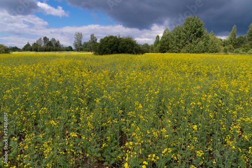 Fototapeta premium A blooming rapeseed field against a blue sky with clouds