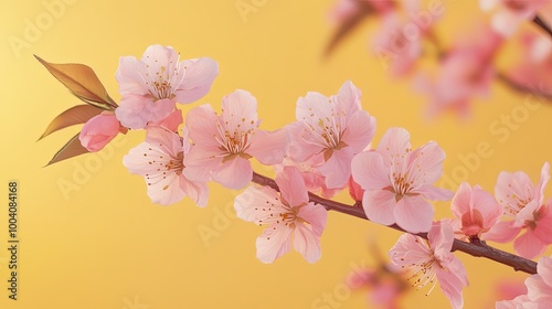 © sarun, Obraz premium A blossoming peach tree branch, its light pink flowers in full bloom, against a gradient yellow background.