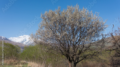 © Роман Смирнов, Obraz premium a blossoming tree in the mountains