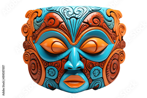 © Rattanathip, Naklejka premium A blue and orange mask with a blue nose and orange eyes. The mask is made of wood and has a tribal design