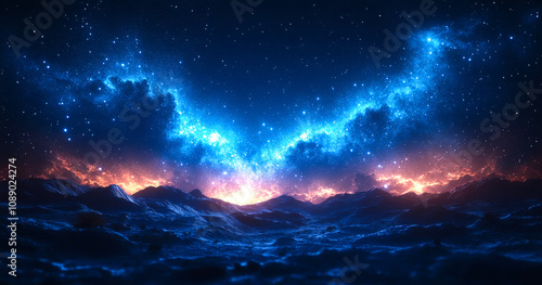 © Анна Терелюк, Fototapeta premium A blue and orange sky with stars and a large cloud. The sky is filled with stars and the clouds are orange