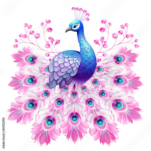 © jinn, Fototapeta premium A blue and pink peacock with flowers in the background