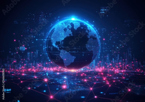 © hakule, Obraz premium A blue and red globe with a city in the background