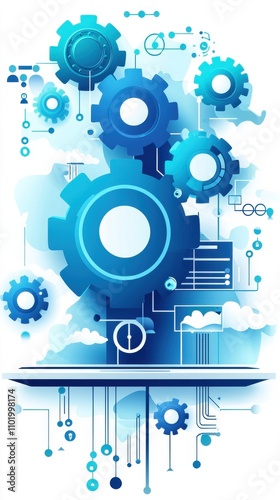 © Exnoi, Fototapeta premium A blue and white image of gears and a clock