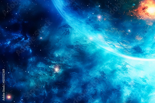 Naklejka premium A blue and white space with two planets and a lot of rocks.