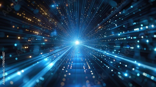 Fototapeta premium A blue and yellow lighted tunnel with a bright light at the end