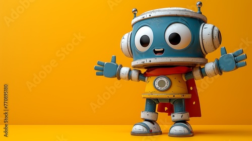 Naklejka premium A blue-and-yellow robot poses before a yellow wall Arms extended, it gazes...