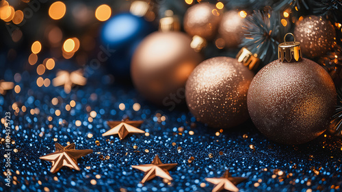 Fototapeta premium A blue background with gold and blue Christmas ornaments. The gold ornaments are stars and the blue ones are balls