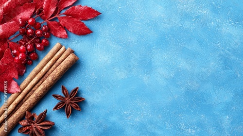 Fototapeta premium A blue background with red leaves, cinnamon sticks, and star anise