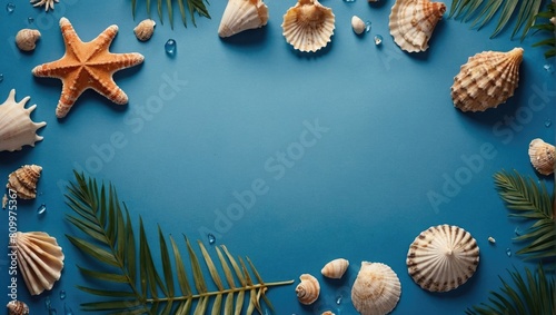 Obraz premium A blue background with shells and palm leaves border a blue empty background side, middle of the background are fully empty 2