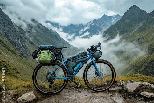 Fototapeta premium A blue bike with gear on the front and back stands against an impressive mountain landscape
