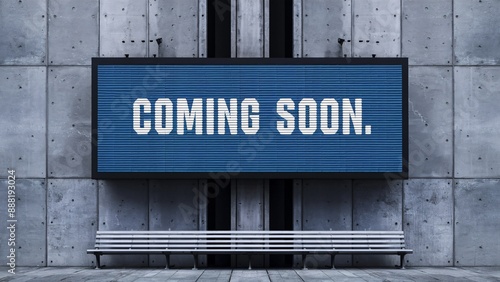 Fototapeta premium A blue billboard on a concrete wall with white text that reads "Coming Soon."