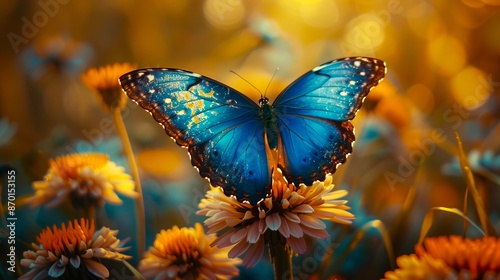 © VISUAL BACKGROUND, Obraz premium A blue butterfly is sitting on top of some flowers.