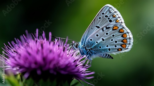 © AnotharS, Obraz premium A blue butterfly with orange spots rests on a purple flower.