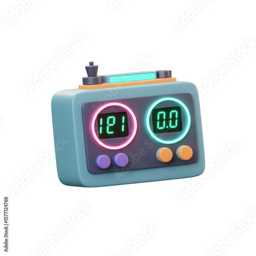 Fototapeta premium A blue cartoon chess clock shows two digital displays, with pink and teal highlights, indicating timekeeping during a game or competition.