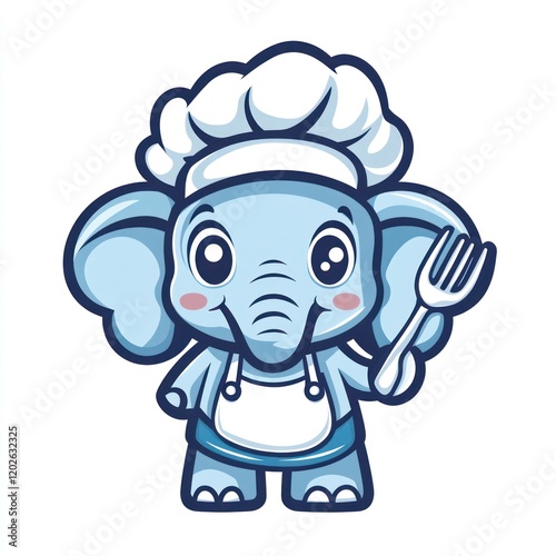 Obraz premium A blue cartoon elephant chef holds a fork on a white background, used for...