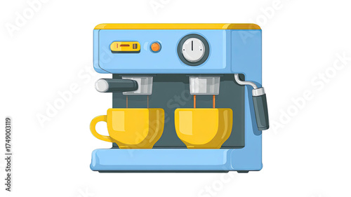 © Muhammad, Fototapeta premium a blue coffee machine brews into two yellow cups isolated on white background