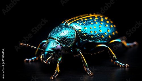 © imam, Fototapeta premium a blue colored bug in dark lighting, generative ai