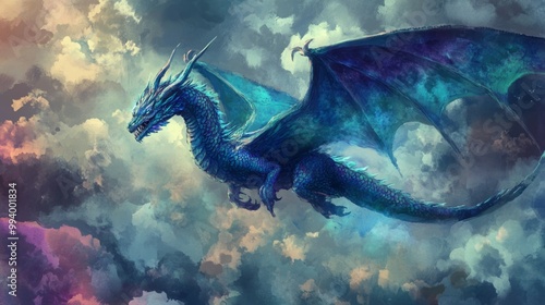 © Lush Diaries, Naklejka premium A blue dragon soars through the clouds.
