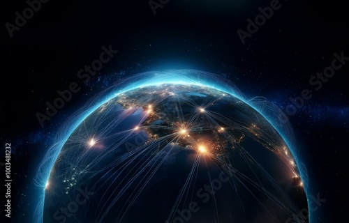© joeycheung, Obraz premium A blue glowing earth with a network of white lines radiating out from cities.